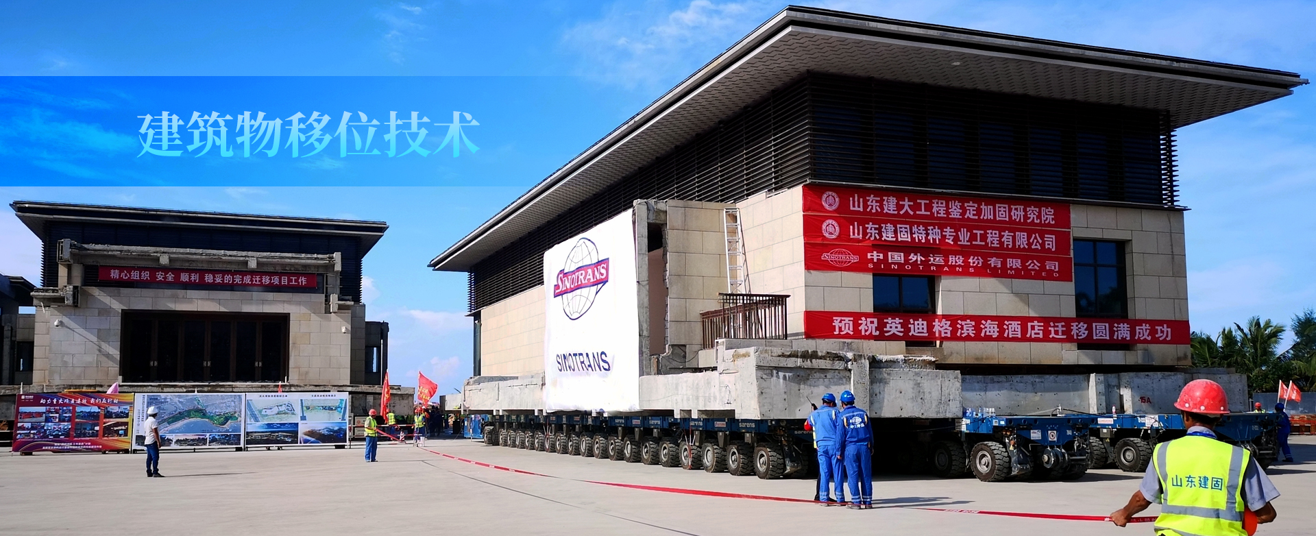 海南紅塘灣酒店為地下1層、地上2層鋼筋混凝土框架結(jié)構(gòu)。占地面積約2400㎡,總建筑面積4658㎡。遷移直線距離約500米,豎向頂升2.3米。紅塘灣酒店遷移工程的成功就位,標(biāo)志著一個(gè)新的記錄誕生:目前國(guó)內(nèi)外首例不規(guī)則扇形車(chē)輛布置、國(guó)內(nèi)拖車(chē)移位單體建筑面積最大(4658㎡)、國(guó)內(nèi)拖車(chē)移位單體建筑重量最重(7500噸)。山東建筑大學(xué)工程鑒定加固研究院、山東建固特種專(zhuān)業(yè)工程有限公司成立于1992年,三十年一直秉承“篤志疑難躬行求新”的企業(yè)精神,完成建筑物鑒定與加固改造、建筑移位、建筑糾傾項(xiàng)目六萬(wàn)余項(xiàng)。山東萊蕪高新區(qū)辦公樓平移項(xiàng)目,建筑面積24000㎡,重量35000噸,是國(guó)內(nèi)外最重平移工程;主持完成的